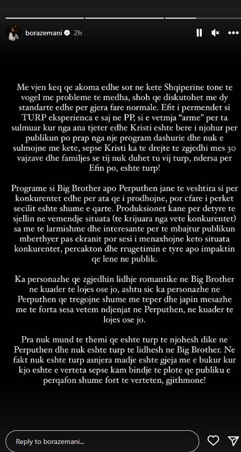 Bora i ka dalur në mbrojtje Efit, me një reagim të gjatë në ‘Instagram’.
