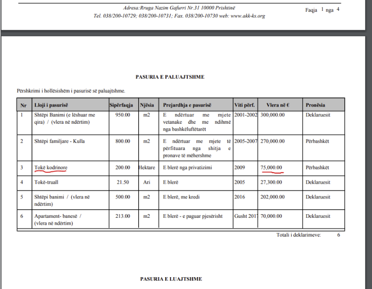 Ndryshe, Sipas deklarimit të pasurisë në vitin 2018 (teksti i Kallxo.com), në kohën kur Haradinaj ishte kryeministër, ai kishte deklaruar se ka blerë 200 hektarë tokë nga privatizimi, me vlerë 75 mijë euro.