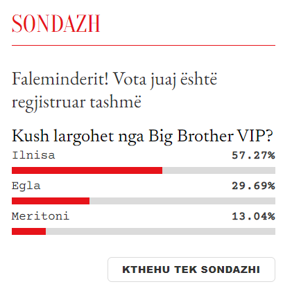 Në vend të dytë qëndron Egla me gati 30% të votave, ndërsa Meritoni duket se ka më pak vota për t`u larguar, rreth 13%.