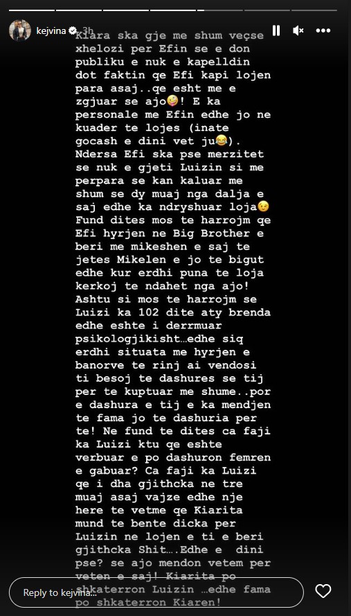 Kejvina ani pse ka kohë prej kur është larguar nga “Big Brother VIP Albania”, ajo vazhdon të komentoj situatat në shtëpi.