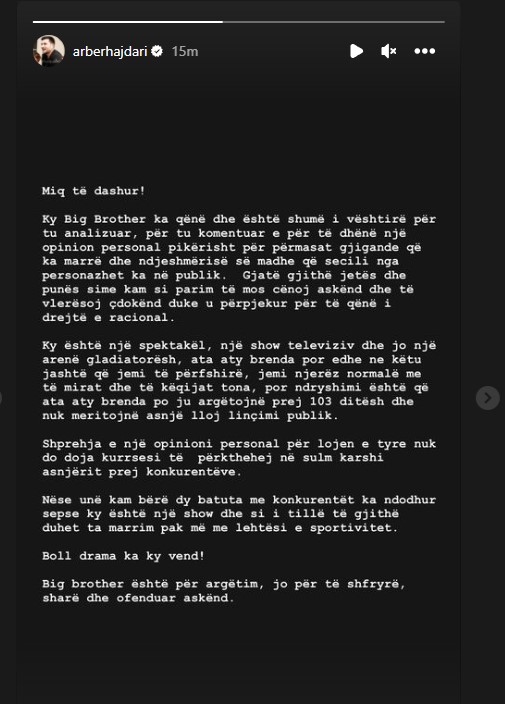 “Dhe ne këtu jashtë që jemi të përfshirë, jemi njerëz normale me të mirat dhe të këqijat tona, por ndryshimi është që ata aty brenda po ju argëtojnë dhe nuk meritojnë asnjë lloj linçimi publik. Shprehja e një opinioni personal për lojën e tyre nuk do doja kurrsesi të përkthehej në sulm karshi asnjërit prej konkurentëve”, shkruan ai.