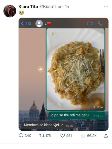 Së fundmi Kiara në një postim në Twitter ka ndarë një pjesë të një bisede të saj më Luizin në Ëhatsapp, ku i ka dërguar atij një foto të ushqimit që po konsumonte, të cilin thotë se e ka gatuar vetë.