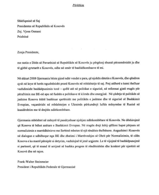Në urim, Steinmeier ka bërë të ditur mbështetjen e Gjermanisë për pavarësinë dhe rrugën evropiane të Kosovës, duke rikujtuar se shteti i tij në shkurt 2008, ishte ndër vendet e para që njohu shtetin e Kosovës.