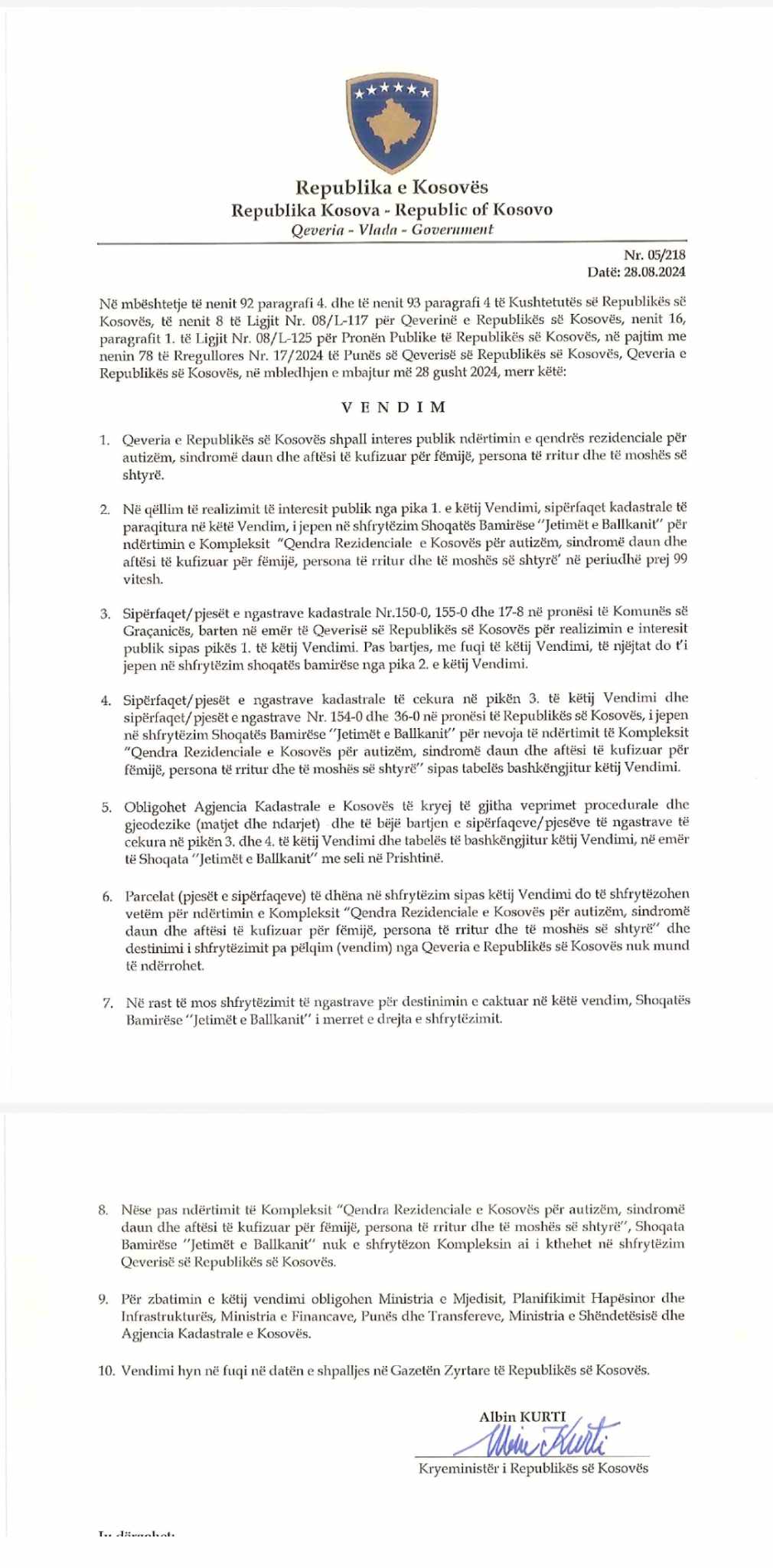 “Sipërfaqet/pjesët e ngastrave kadastrale të cekura në pikën 3. të këtij Vendimi dhe sipërfaqet/pjesët e ngastrave Nr. 154-0 dhe 36-0 në pronësi të Republikës së Kosovës, i jepen në shfrytëzim Shoqatës Bamirëse “Jetimët e Ballkanit për nevoja të ndërtimit të Kompleksit “Qendra Rezidenciale e Kosovës për autizëm, sindromë daun dhe aftësi të kufizuar për fëmijë, persona të mitur dhe të moshës së shtyrë “, thuhet në vendim.