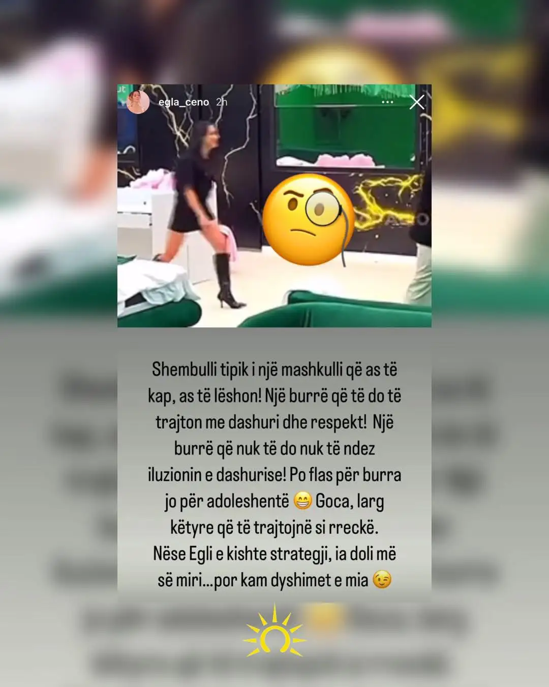 Ajo gjithashtu e përmend dhe situatën brenda shtëpisë së “Big Brother VIP”, duke thënë se nëse veprimet e Eglit ishin pjesë e një strategjie, atëherë ia ka dalë më së miri, por shpreh edhe dyshimet e saj.