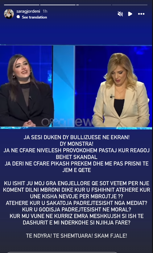 “Ja sesi duken dy bullizuese në ekran! Dy monstra! Ja në çfarë nivelesh provokohem pastaj kur reagoj bëhet skandal. Ja deri në çfarë pikash prekem dhe më pas prisni të jem e qetë. Ku ishit ju moj gra engjëllore që sot vetëm për një koment dilni mbroni dikë kur u fshihnit atëherë kur unë kisha nevojë për mbrojtje? Atëherë kur u sakatoja padrejtësisht nga mediat? Kur u godisja padrejtësisht në moral? Kur mu vunë në kurriz emra meshkujsh si ish të dashurit e mi, ndërkohë si njihja fare? Të ndyra! Të shëmtuara! S’kam fjalë!”, shkruan Sara në Instagram./Lajmi.net/